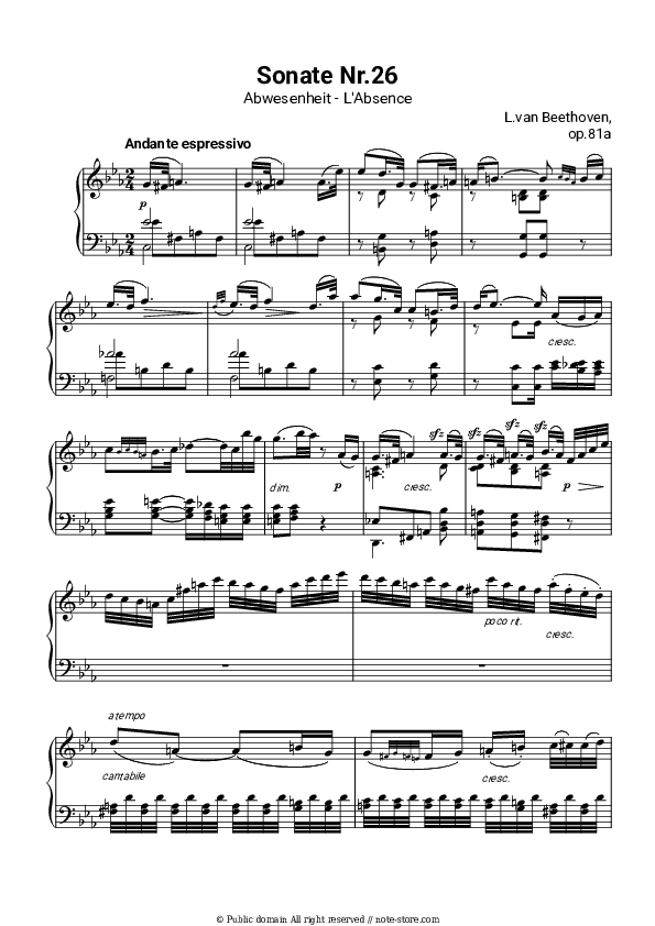More about sheet music Ludwig van Beethoven Piano Sonata No. 26 (“Les Adieux”), Op. 81a, II. Abwesenheit