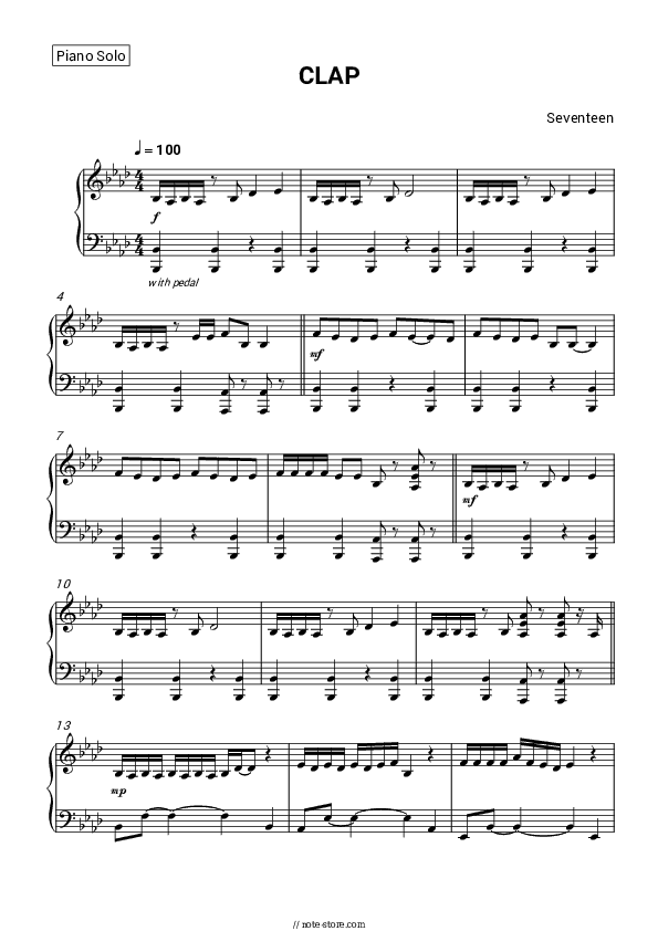 The piano sheet music for the melody Clap, performed by SEVENTEEN, is currently in Piano.Solo arrangement. This Pop-genre track was created by expert musicians, ensuring the premium quality of musical notation.